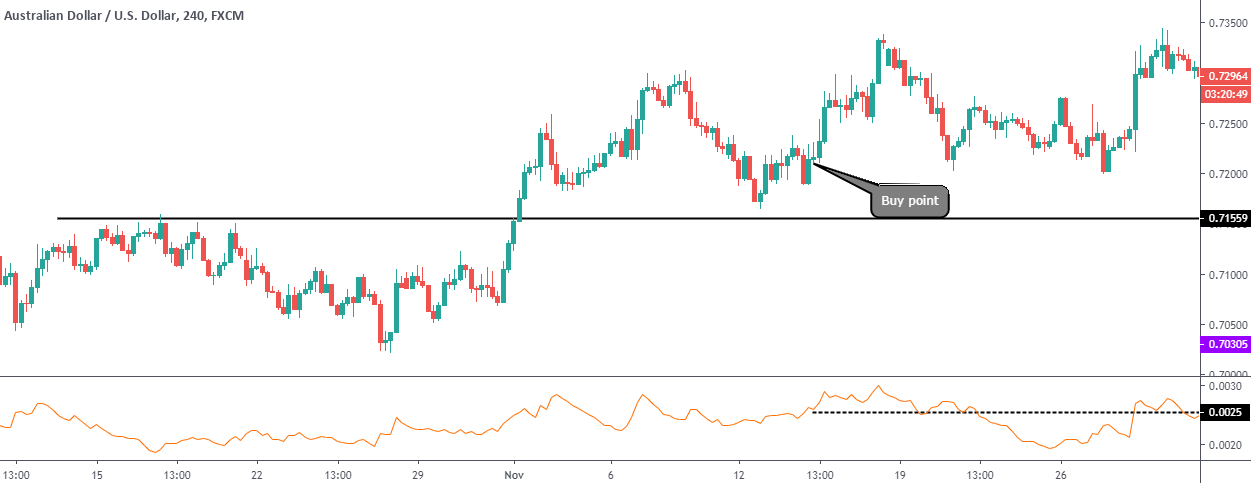 Below is the chart of AUD/USD on the 4H timeframe. The market is in an uptrend, and we wish to enter a buy trade. Analysis of the trade is done, and the buy is taken at the point mentioned. The target is placed around 100 pips. When does the market move 100 pips? The market moves by 100 pips only during news or market open. Hence, the trade is taken at 09:00 AM after an hour, the US market is opened. Now, we plot the ATR indicator. This indicator indicates how long the trade will take to perform on an average. We see that the black dotted line is pointing to 0.0025, which means that each 4H candle is moving about 25 pips on an average. Since our target is 100 pips, we can expect the trade to take at least four 4H candles to move 100 pips. In other words, we must wait at least 16 hours for the trade to perform.